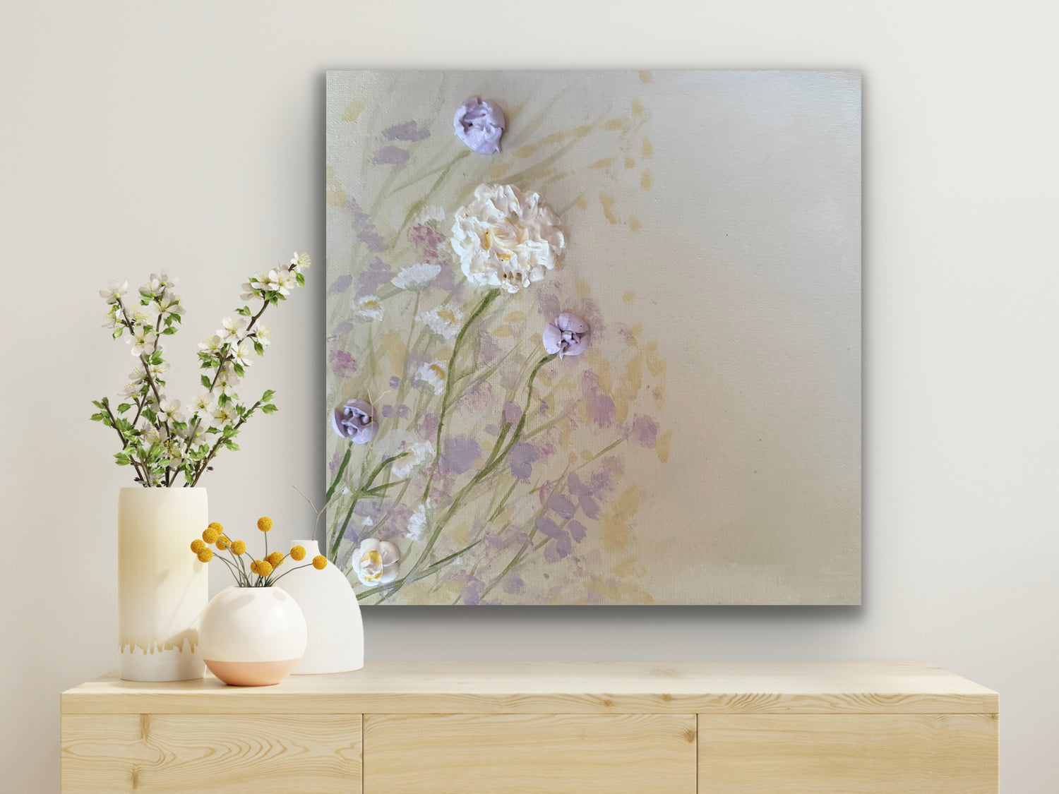 Her work is known for its soft colour palettes, delicate textures, and a sense of calm, bringing a light and peaceful presence into a space.
