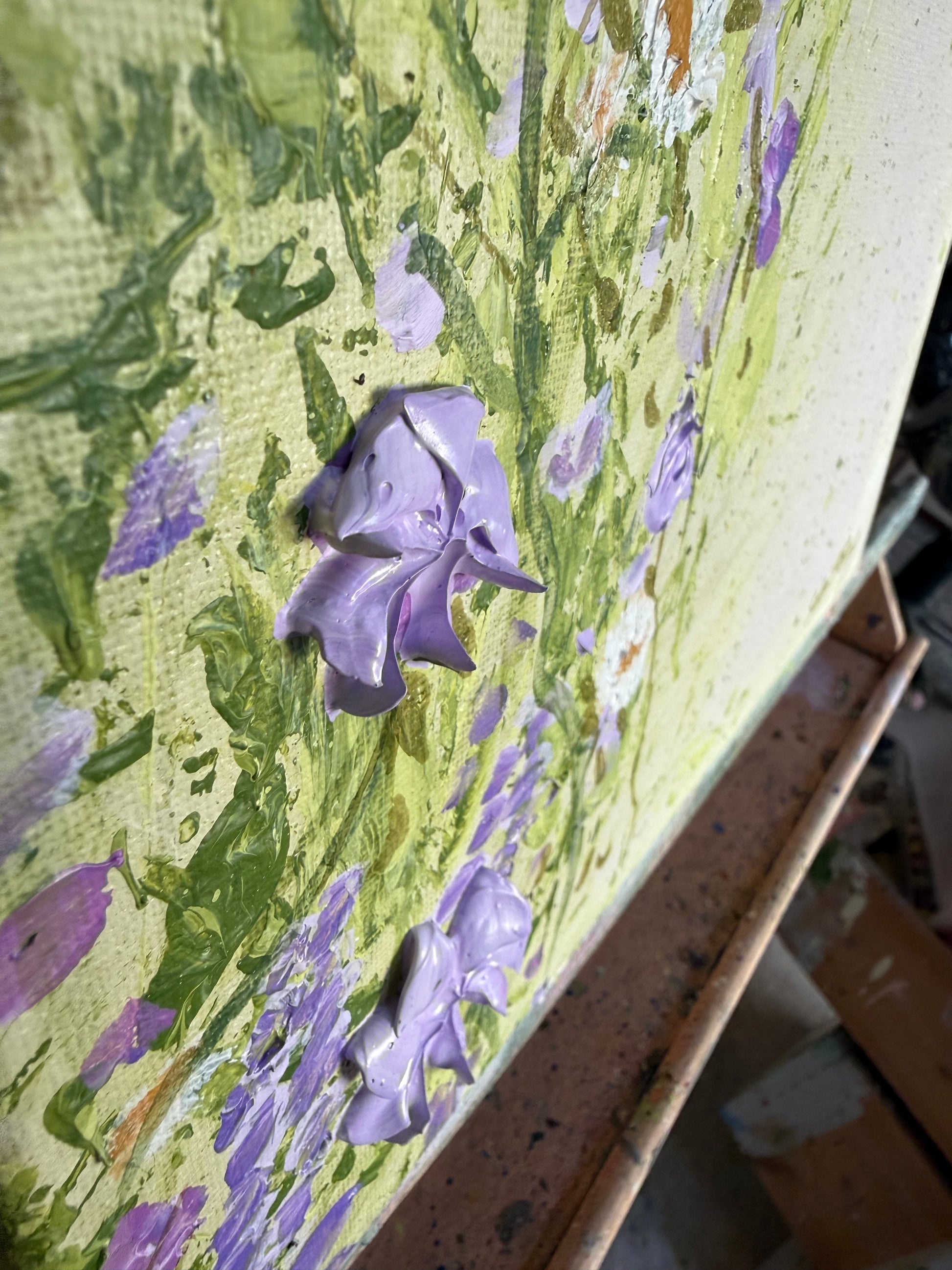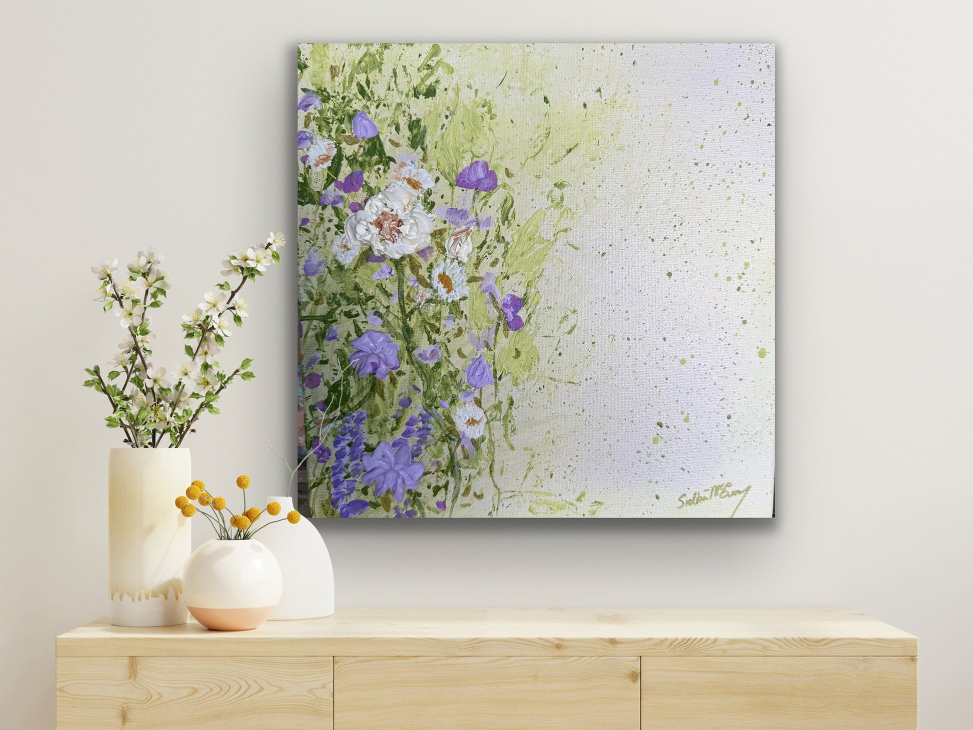 Loose painterly layers create an airy, luminous background, while expressive impasto flowers rise from the canvas, adding texture, movement and depth.