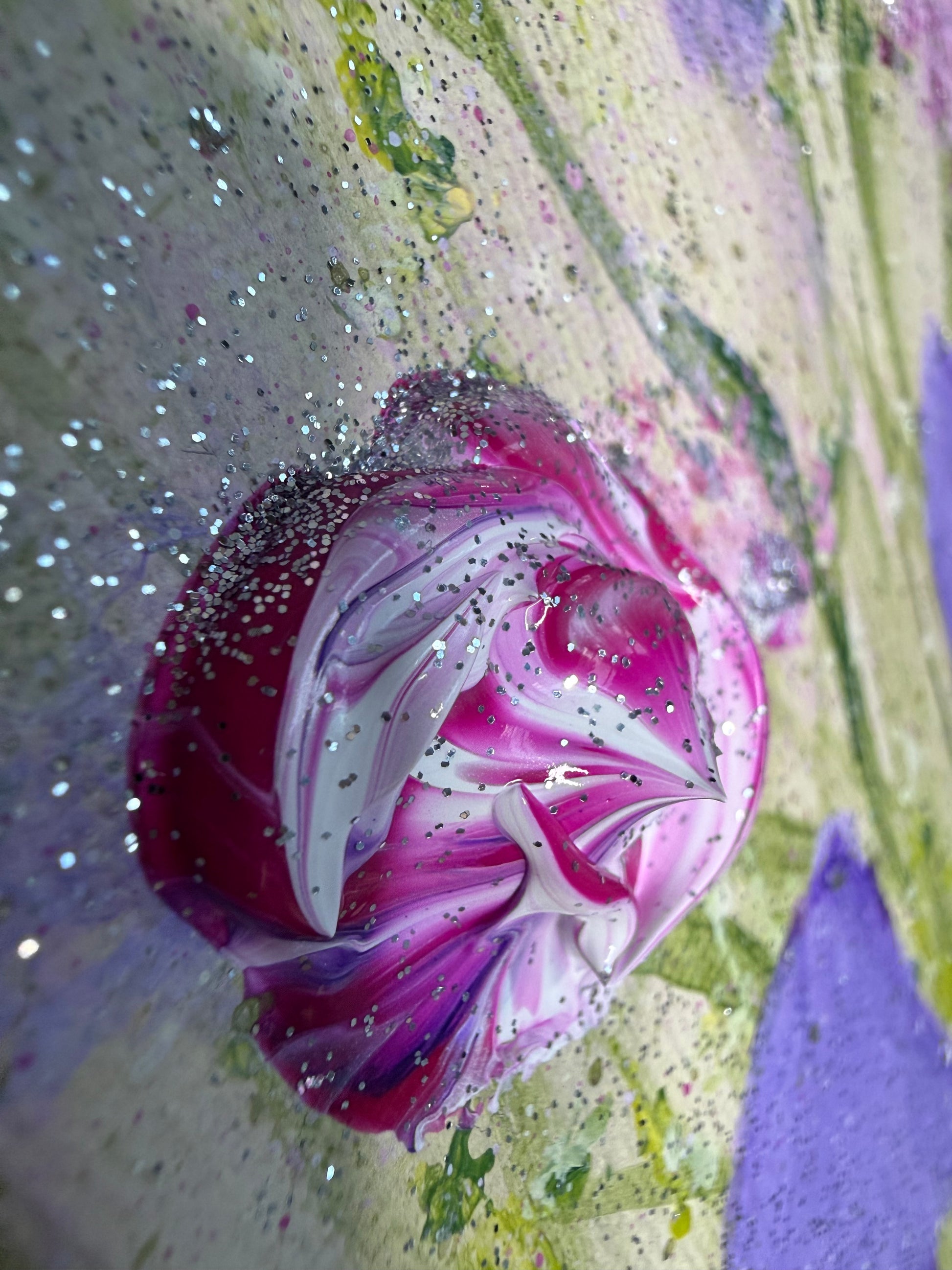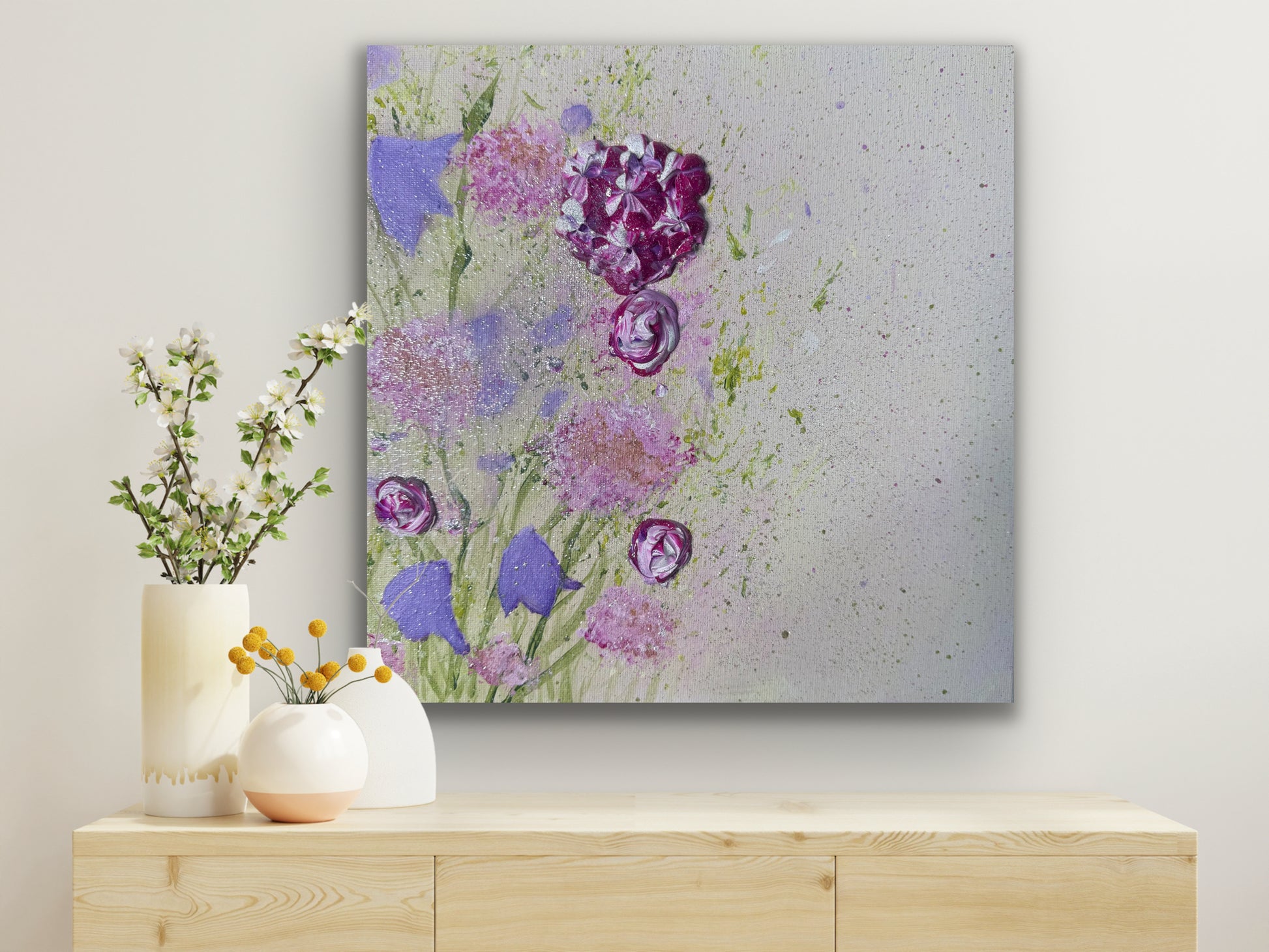 Loose painterly layers create a soft, airy meadow background, while expressive impasto flowers rise from the canvas, adding texture, depth and movement. Subtle shimmering details catch the light, evoking the sparkle of morning dew on petals.