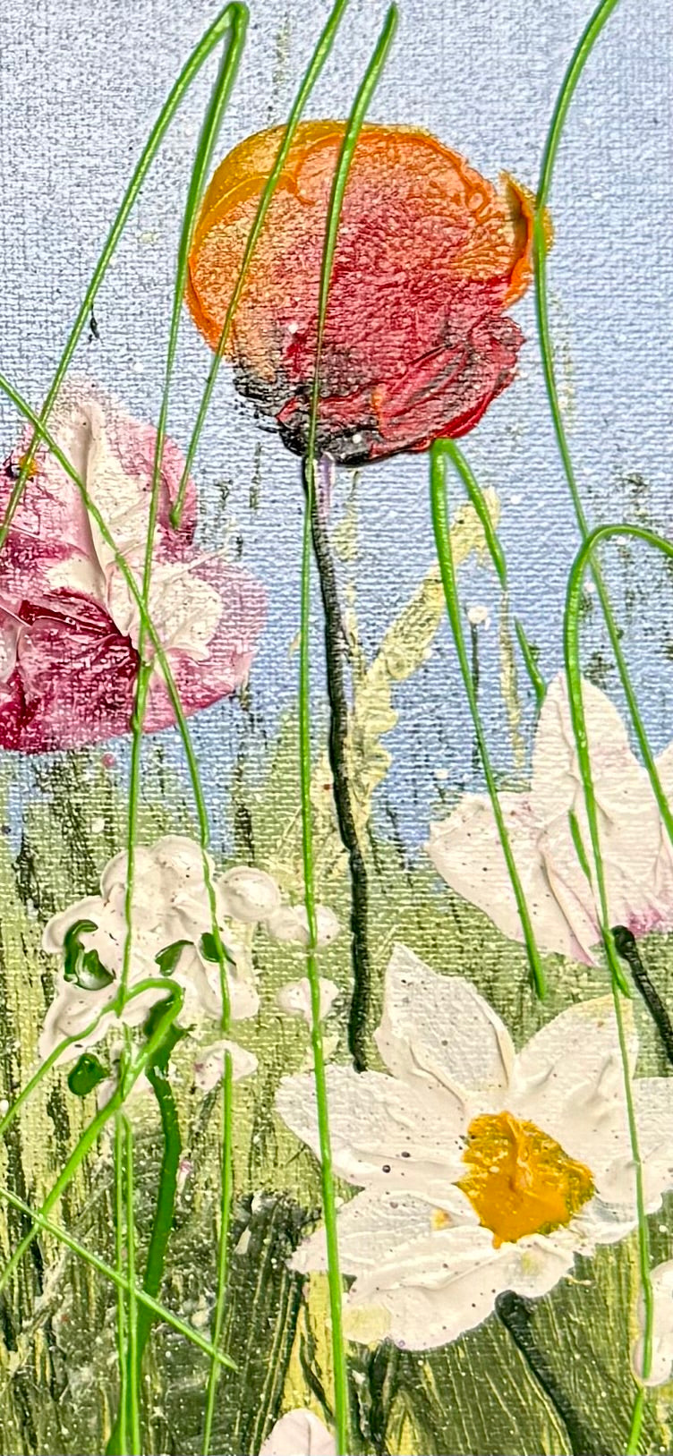 Dancing Through Summer is an original acrylic painting capturing the lightness and movement of wildflowers swaying beneath an open sky. Layers of textured acrylic and expressive mark-making create depth and energy, while the soft colour palette evokes a calm, natural atmosphere.