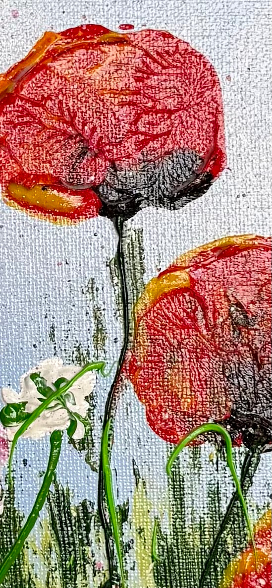 Summer Meadow Light is an original acrylic painting inspired by the warmth, colour and natural energy of a summer meadow. Bright poppies rise through grasses and wildflowers, with layered texture and expressive mark-making creating depth, movement and atmosphere.