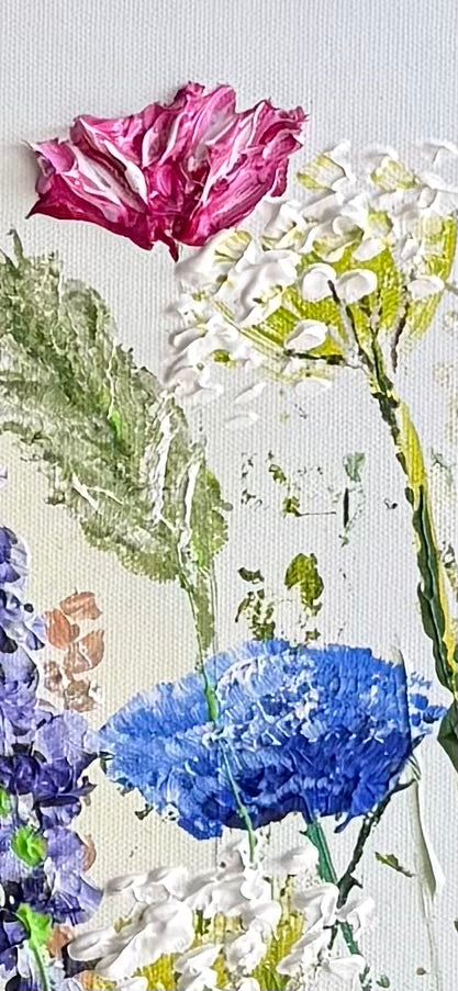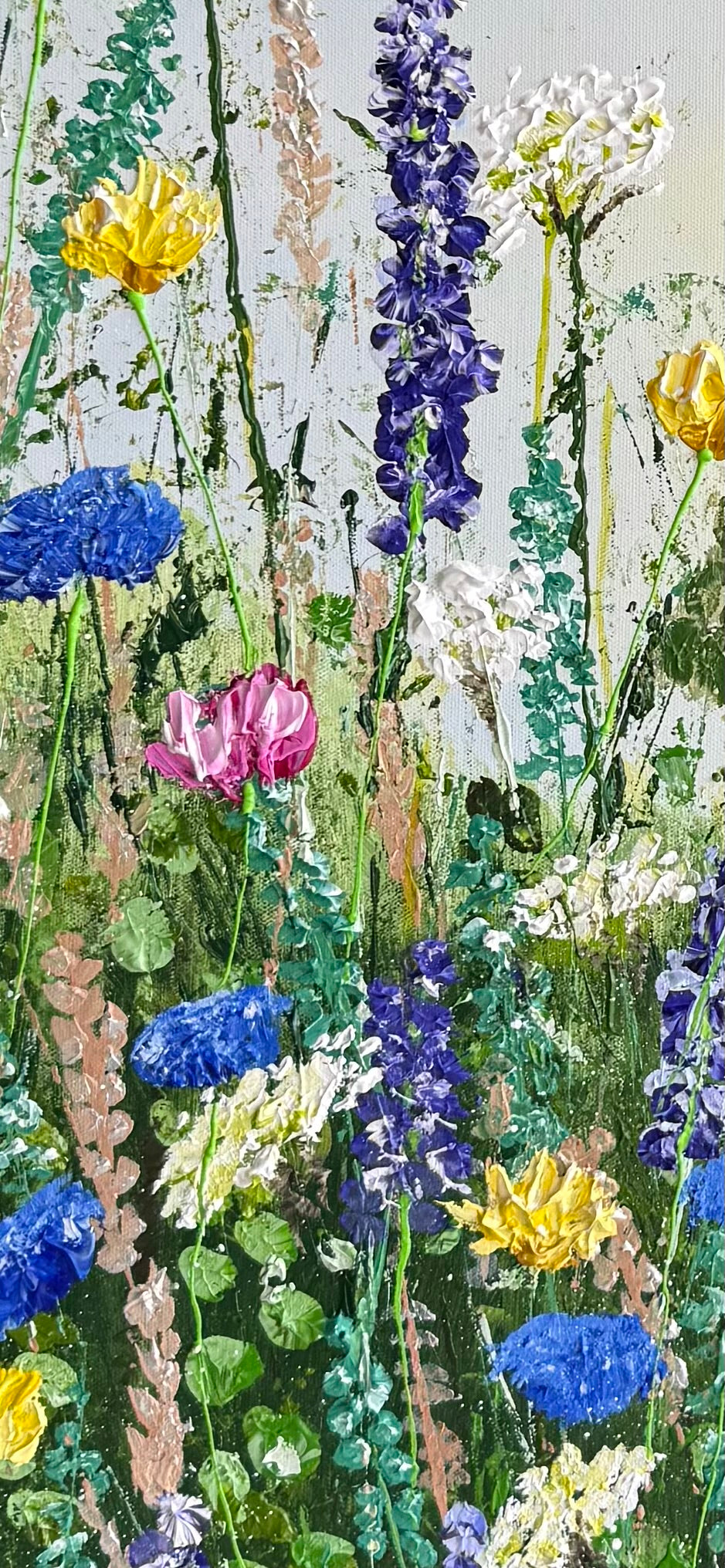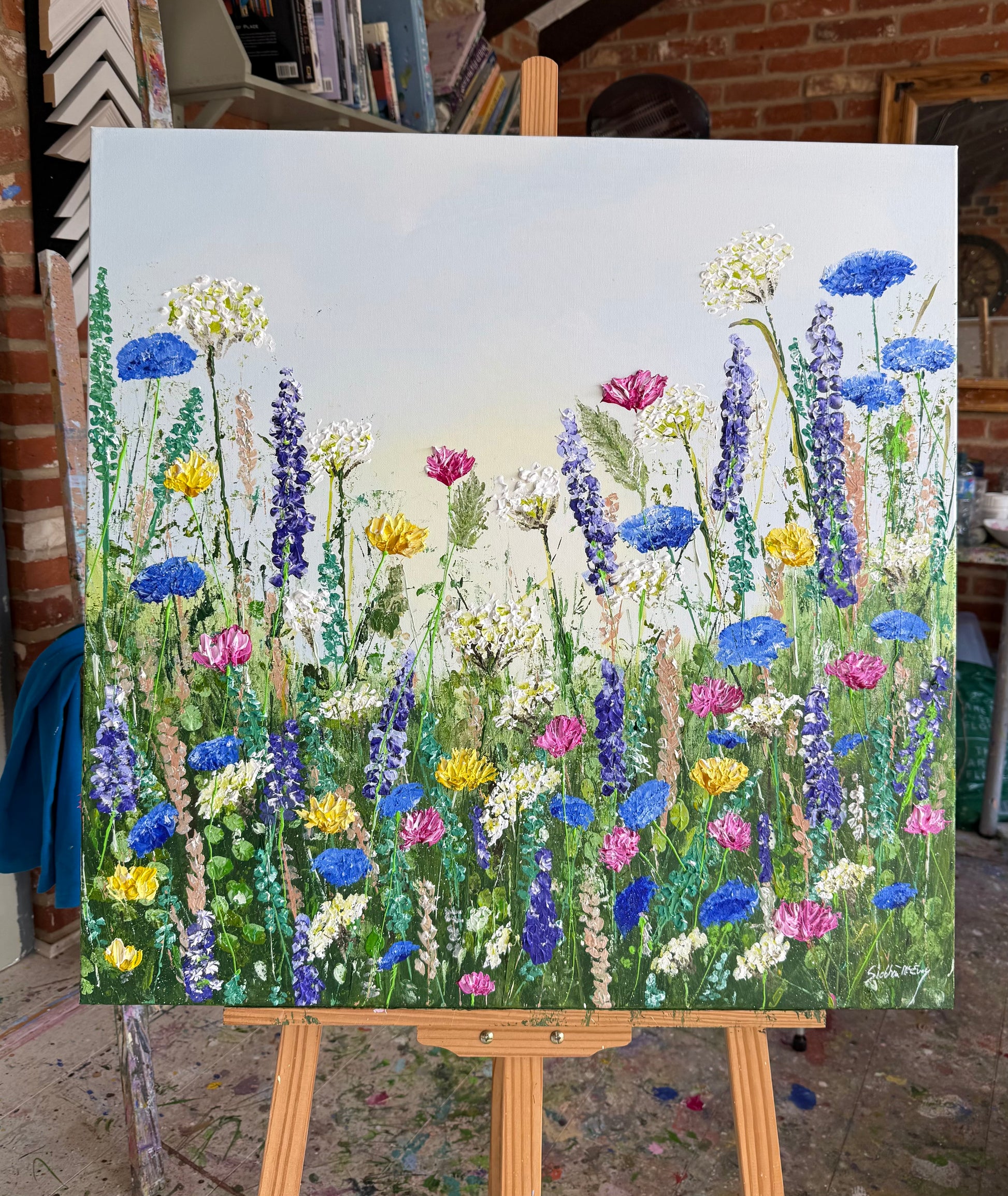 Summer Meadow Sky was inspired by the feeling of standing amongst tall wildflowers on a bright day, with open sky above and the gentle movement of colour all around. Layers of expressive brushwork and rich texture bring the meadow to life, capturing both the energy and calm of the landscape.